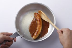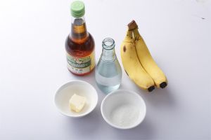 放入剥好皮的香蕉,一面煎半分钟后再翻边煎另一面,待整根香蕉裹上了糖色,再将苹果醋饮中加入适量冰块,现在就可以搭配享用了。