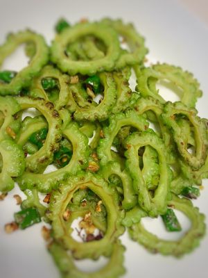 姜末蒜末花椒放入油中炒热后放入青椒和苦瓜,焙干后即可食用。