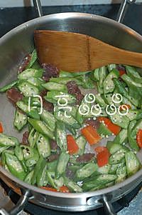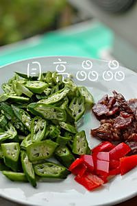 秋葵刷洗干净,切成小段或者厚片。腊肠和红椒也切片。