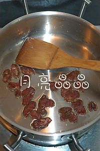 锅烧热后放油(油稍微少点,因为腊肠本身也会出油),油温上来放入腊肠片煸炒至变色出油。