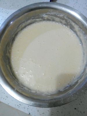 鸡蛋在盆中打散,起泡最好。加入酸奶、适量绵白糖、少量植物油