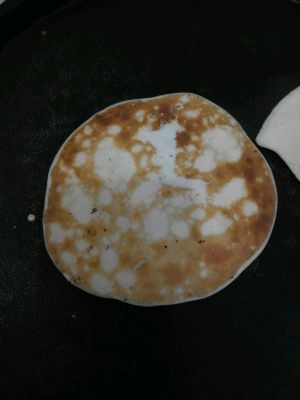 锅加热,不需要放油,直接倒入酸奶鸡蛋液,成形后再翻过来