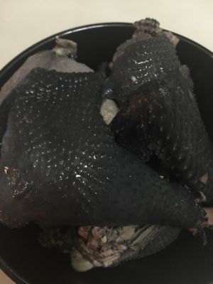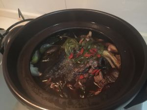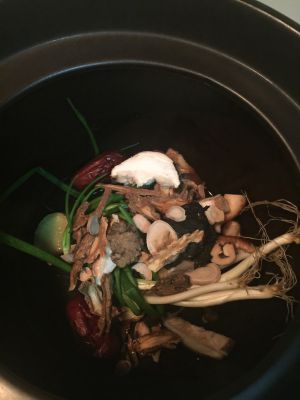 将四物、葱姜、大枣、香菇、焯好的鸡肉、适量水放入锅中,开锅后转中小火熬制一个半小时