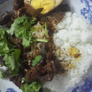 米饭好了,浇上卤肉吧还有鸡蛋(配青菜也可以,家里没有就用香菜了