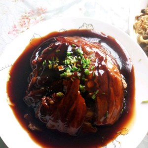 生粉加水加少量老抽,在锅里熬酱汁,浇到扣肉盘子里,OK