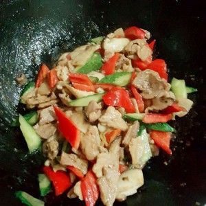 将香菇倒入锅中,翻炒几分钟,使香菇吸收葱姜香味。香菇变软后放入黄瓜红椒,再翻炒几下,倒入炒好的肉片,加入少许盐。翻炒均匀后出锅即可。