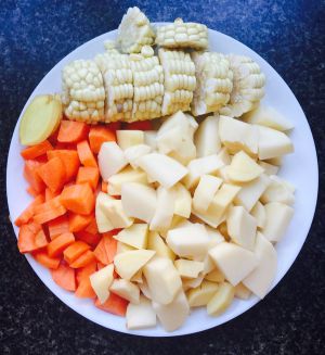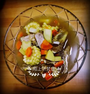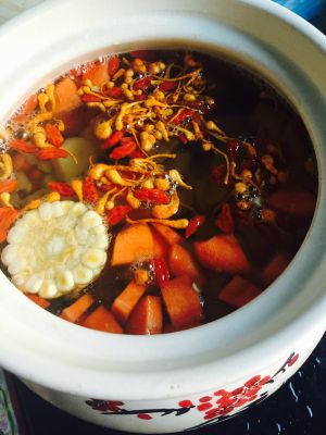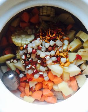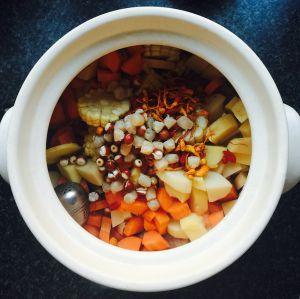 排骨在最下,其次是土豆胡萝卜玉米虫草花芡实瑶柱枸杞和调料盏