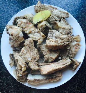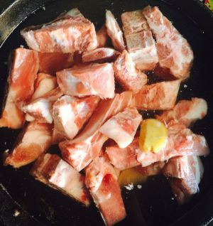 排骨剁块后入冷水中,加姜片,一半料酒烧开,煮开后撇去浮沫捞出排骨,此步骤为飞水,为了去血水和腥味