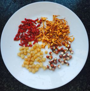 芡实和瑶柱清洗后用清水浸泡三十分钟,枸杞虫草花略清洗不需要浸泡。