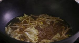 锅中入油,加入牛肉,蘑菇,胡萝卜,姜粒和木耳煸炒后,放入两碗水和浓汤宝