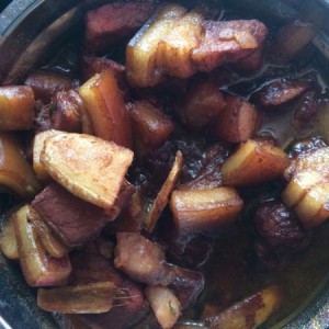 1:锅热放油加热后放入葱生姜(留一半从装盘前撒)爆出香味后放肉翻炒片刻后加酒后放老抽、蚝油、海鲜酱翻炒均匀后倒入适量水大火煮开小火慢炖至肉烂放盐和土豆小火慢炖至土豆熟烂放少许白糖和醋还有葱炒匀即可