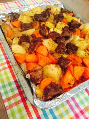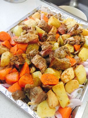 将羊肉取出 倒掉汁水 改刀成块。洋葱垫底 平铺蔬菜 羊肉 继续220度 上下火30分钟。可撒烧烤粉和盐 根据口味调节