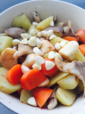 加入大蒜 黄油 孜然粉 盐翻拌均匀 腌制半小时以上