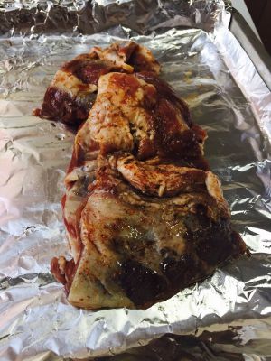 新鲜腌肉用叉子叉眼 加盐和烧烤粉 孜然腌制 密封后放入冰箱冷藏一夜