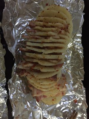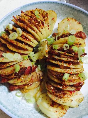 土豆烤好以后,将培根夹入每片土豆中,再撒上一层孜然和盐,刷一层橄榄油,再撒上一层孜然和白芝麻