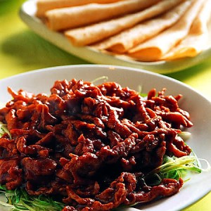 吃的时候用蛋皮卷起肉丝和大葱一起吃
