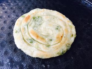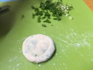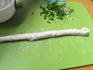 饺子皮刷上橄榄油,四个相叠排列,抹盐,撒葱花