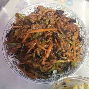 先炒肉,炒到泛白,八分熟,盛出备用,但是我忘记拍照片了,对不起啦,然后锅里留油,炒葱,姜,蒜,小红辣椒,和豆瓣酱,炒出香味,在放胡萝卜,青椒,木耳,炒快熟了