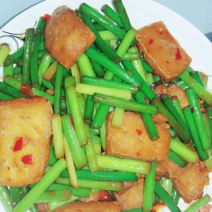 锅底爆香豆瓣酱,再加酱油爆香,把蒜薹倒进锅里,炒至八分熟