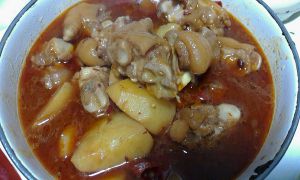 准备的材料,土豆切大块哦。猪蹄先用开水煮了一分钟。变色就好了。之后用水加了一大勺料酒。泡半小时。主要是去腥。主要做法。把猪蹄控干水,热油。把猪蹄煎到微黄。之后捞起来。锅底留油炒生姜大蒜,之后小火放入干辣椒。炒出味了,放入老干妈香辣酱。继续小火炒香。放入猪蹄。炒均匀。之后倒入啤酒。放入土豆。之后把所有的转入高压锅。大火压10分钟。