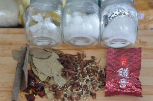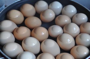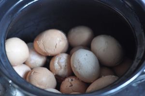 茶叶及香料放入锅中,放入敲碎的鸡蛋,倒入开水,烧开后放入盐、老抽、糖,煮十分钟