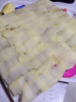 将削好的薄片排列在烤盘上