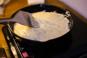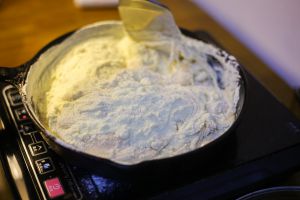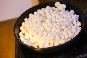 然后把棉花糖倒进锅里搅拌。我买的棉花糖是那种迷你的,因为觉得小一些的可能更好融化(要用不粘锅!!)