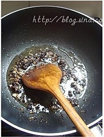 锅下油烧热,爆香蒜粒和豆豉粒,放凉后备用。