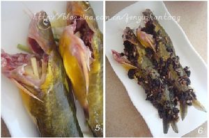 鱼腹内纳入姜丝和蒜,鱼身均匀摸上盐和鸡精。再将爆香的豆豉粒和蒜粒淋在鱼上,腌制10分钟。