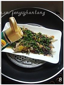关火后,蒸好的黄骨鱼淋上酱油,撒上葱粒,虚蒸3分钟。