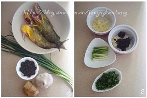 豆豉洗净切碎,姜去皮切成6片,再将其中2片切成姜丝,蒜去皮2瓣切碎,另2瓣蒜用刀拍扁,葱洗净葱头切成段,余下的葱叶切成碎粒备用。