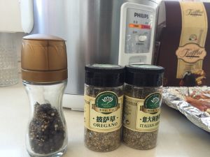 刚才撒上的香料,黑胡椒、披萨草、意大利香草。