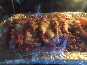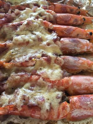 烤盘铺上锡纸,摆好开背的红虾,把炒好的洋葱碎铺在虾背上,芝士碎撒在洋葱碎上,撒上调料。