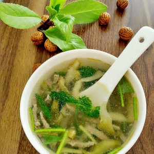 盛出后,淋少许香油,清淡味美的榨菜肉丝汤,可以享用了。