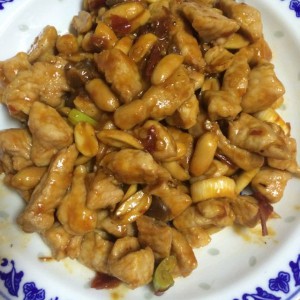 放适量老抽(少放看颜色调整放入的量),放醋和糖,勾少许薄芡淋入锅中,最后倒入花生米和葱,然后加适量盐,关火趁热放鸡精