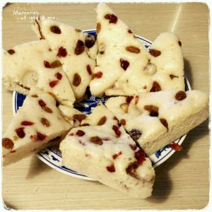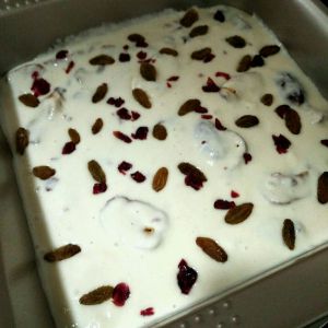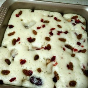 把高粉,红枣加入步骤1的水,充分搅拌,倒入容器内,抖一抖,铺平。加入葡萄干在表面点缀。静待半小时发酵到2倍大。