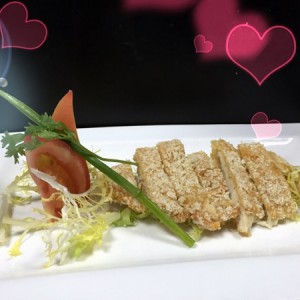 这是刚刚的两块鸡胸,片开后,在鸡肉表层撒盐(适量),胡椒粉(适量),放少许料酒,去腥味。用刀背,或刀尖,将肉捶打一下,炸出后更松软
