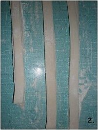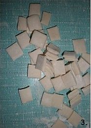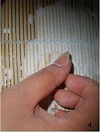 在寿司帘上撒点面粉,用拇指按住面块向前撮,要又薄又卷