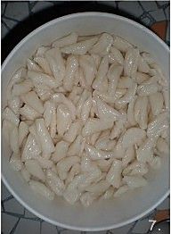 锅内加水烧开,放入猫耳朵,煮5分钟(这步主要是为了去掉猫耳朵上粘的面粉)