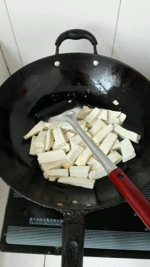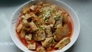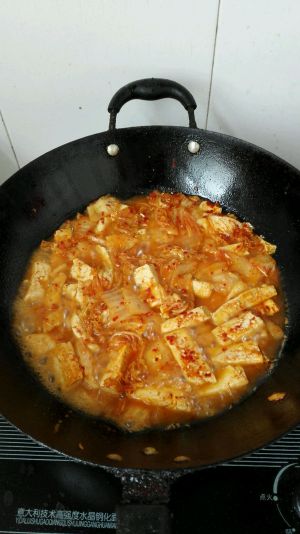 辣白菜放入锅中,炒一下,加少许水,盐,鸡精,盖上锅盖炖