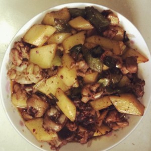 放锅加油,油热放辣椒葱姜蒜,放少许大红袍。放入鸡腿土豆翻炒。锅干倒入半碗水。盖锅盖闷。