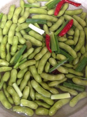 把毛豆和调料全部倒进锅里,放适量的盐,加漫过毛豆的水,煮12到15分钟