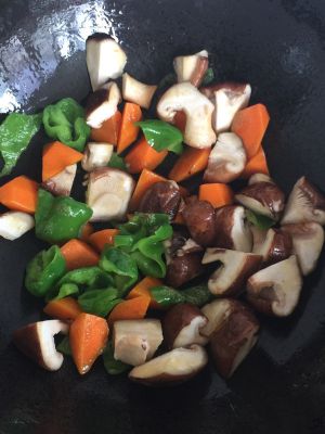 另起一锅,中小火,以青椒,胡萝卜,香菇的顺序倒入翻炒断生