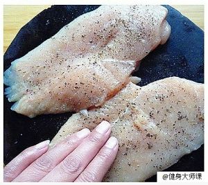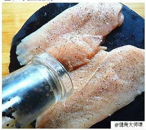 把鸡胸肉从中间切开,撒上少许食盐+黑胡椒