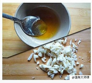 在蜂蜜中加入一勺油,搅拌匀,蒜切成末
