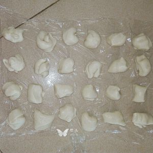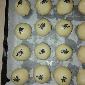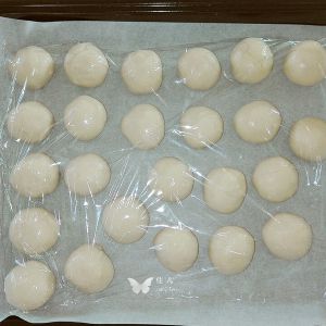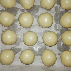 平均分成12份,按每份25g的重量称出馅料,用手握成球状备用。