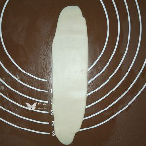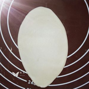 将松弛好的面团用手掌按扁,再用擀面杖擀成椭圆形。