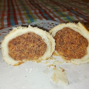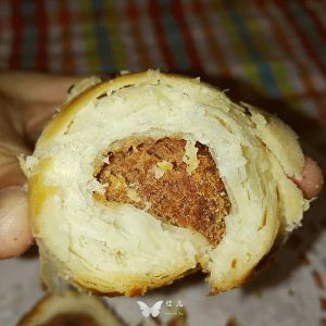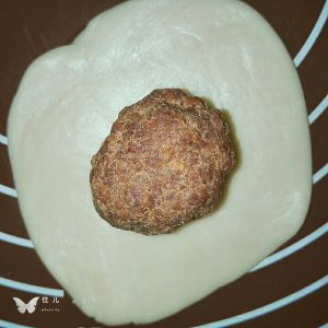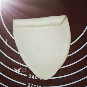 包入肉松馅,将面皮向上收拢,最后把收口反复捏紧,以免在烘烤的时候肉馅爆出来。