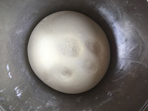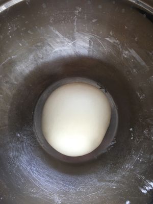 面团放回到盆中 在盆口包上保鲜膜 注意 不是包面团上!!!此刻面团就不用管了 让它发酵 可以坐热水发酵 也可以放有发酵功能的烤箱 这样会加快发酵速度