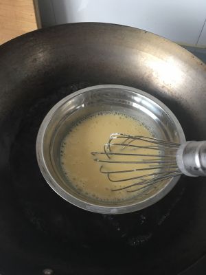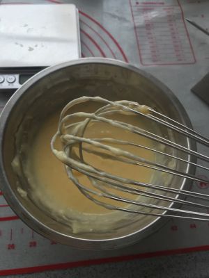 牛奶加热到80度左右加入混合的粉打入一个蛋 边加热边搅拌